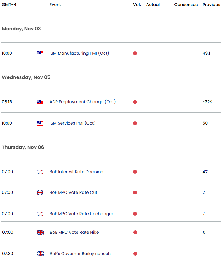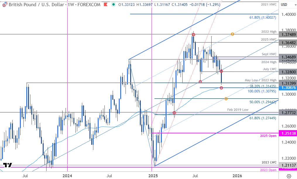 The British Pound is poised to mark a second weekly decline with GBP/USD plunging to six-month lows in the wake of the Fed rate decision. A break of the October range has now extended nearly 4.9% off the yearly highs and keeps the focus on a pivotal support zone into the November open. Battlelines drawn on the GBP/USD weekly technical chart as traders look ahead to the Bank of England interest rate decision.