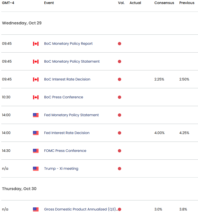 The highly anticipated Bank of Canada and Federal Reserve rate decisions are on tap tomorrow, with both central banks widely expected to deliver 25bps cuts. Traders will focus on forward guidance from the Fed, particularly regarding expectations for the December policy meeting and any signal on the future of quantitative tightening (QT). Markets currently assign an 88% probability of another rate cut before year-end. Stay nimble into the release & subsequent presser with Powell and watch the weekly / monthly close for guidance on the next directional move. Review my latest Canadian Dollar Short-term Outlook for a closer look at the near-term USD/CAD technical trade levels.