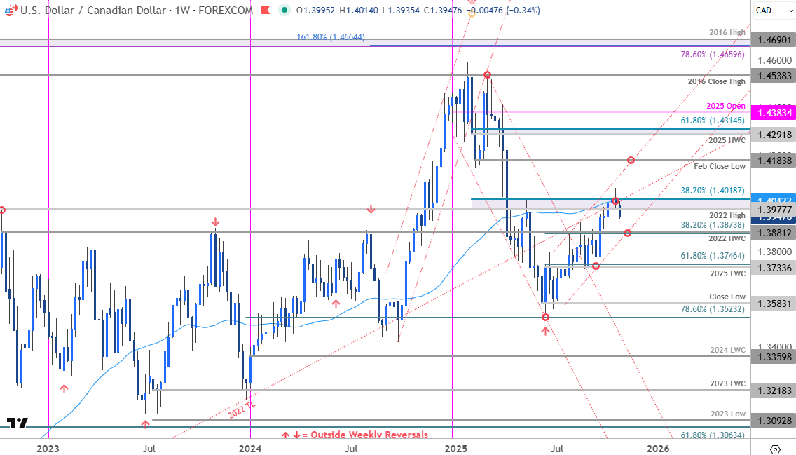 Weekly support rests at 1.3874/81- a region defined by the 38.2% retracement of the June advance and the 2022 high-week close. Note that basic channel support converges on this threshold over the next few weeks and a break / close below this slope is needed to suggest a more significant high is in place / a larger reversal is underway. Subsequent support objectives rest at the 2025 low-week close (LWC) / 61.8% retracement at 1.3734/46 and the yearly close low at 1.3583- both levels of interest for possible downside exhaustion / price inflection IF reached.