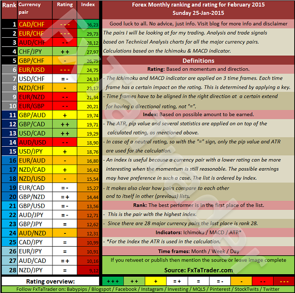 Analysis based on TA charts for all the major currency pairs. Good luck to all. No advice, just info. Every month the Forex ranking rating list will be prepared on the last Sunday of the month for the coming month. All the relevant Time Frames will be analyzed and the ATR and Pip value will be set.