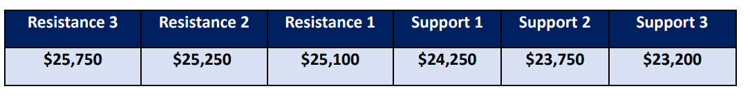 The index is challenging resistance at 25,100, with support established near 24,250.