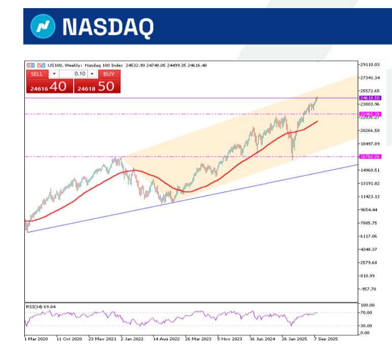 The Nasdaq ended the session at 24,611, up 108 points (0.44%). The index has risen nearly 6% over the past month and more than 24% over the past year. Trading Economics’ models and analyst outlooks place it around 24,477 by quarter-end and 24,396 over the next twelve months.