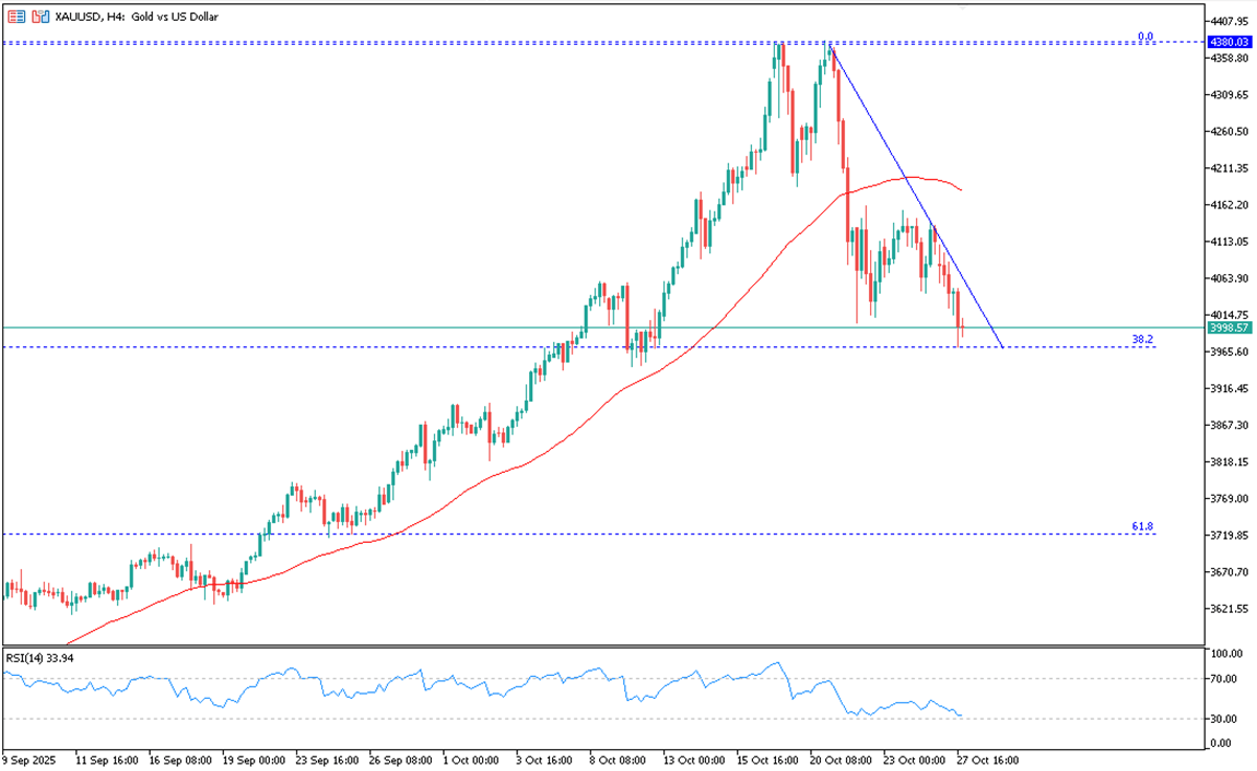 Gold inched up to around $3,990 per ounce on Tuesday but remained near a two-week low, as optimism over US–China trade progress weighed on safe-haven demand. Over the weekend, officials from both countries said they had reached a framework agreement on tariffs and other key issues during talks in Malaysia, paving the way for Presidents Trump and Xi to finalize the deal later this week in South Korea.