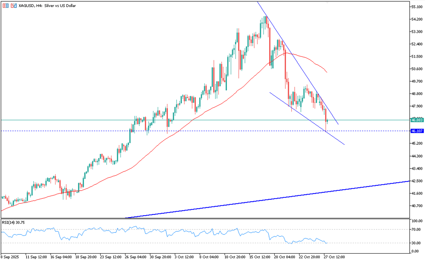 Silver hovered near $46.80 in Tuesday’s Asian session, extending its third day of losses after falling 3.78% as investors moved to risk assets amid optimism over U.S.–China trade talks. Officials from both countries announced in Malaysia that a framework deal on tariffs had been reached, paving the way for Trump and Xi to finalize it in South Korea this week.