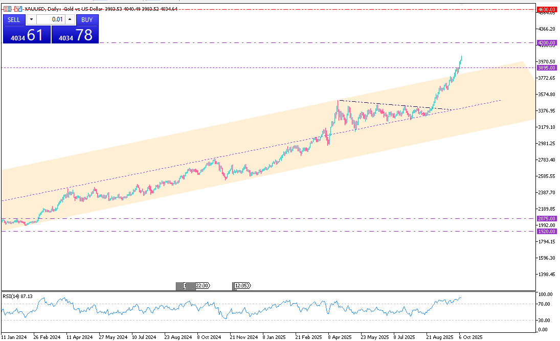 Gold surged above $4,040 per ounce, setting a new record high as global uncertainty and the Fed’s dovish stance drove investors toward safe-haven assets. With the U.S. government entering its second week of partial shutdown, key economic data releases have been delayed, making it harder to assess the economic outlook.