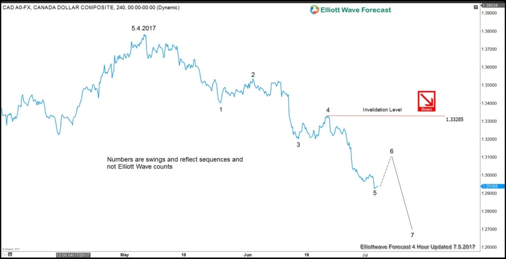 USDCAD 4 Hour chart above shows a 5 swing bearish sequence from May 4, 2017 high. Please note that this is not the same as 5 waves impulse, but rather the number of swing count. The 5 swing sequence suggests that while the sixth swing bounce fails below swing #4 high at 1.3328, more downside can be seen in the pair.