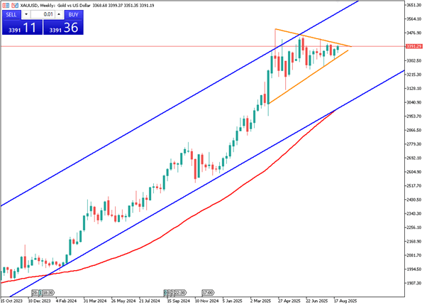Gold slipped to $3,390 in early European trading Thursday, retreating from a three-week high near $3,400 as the U.S. Dollar firmed and profit-taking set in. Still, demand lingered amid Fed independence risks after Trump moved to dismiss Governor Lisa Cook. Investors now focus on Thursday’s U.S. Q2 GDP, expected at 3.1% annualized, followed by Friday’s PCE inflation data. Stronger readings could strengthen the Dollar and curb gold’s upside.