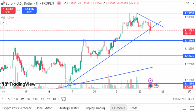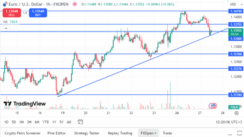 Hello everyone! A downward reversal may be brewing for the EURUSD pair. On the H1 timeframe, during its downward movement, the price is trying to break through the local upward trend line. In case of a successful breakout, the target for a bearish movement may be the support level of 1.1276.