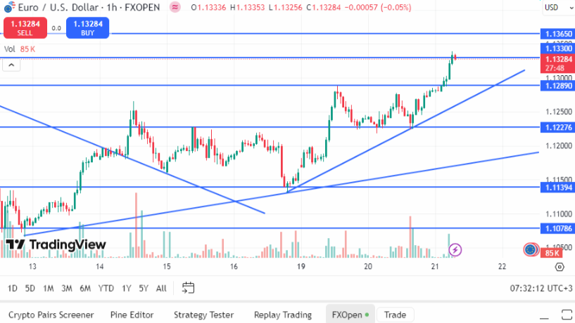Hello everyone! The EURUSD pair continues to show an upward trend. As I expected earlier, the price of this pair reached the resistance level of 1.1330 during its upward movement. I think that the bulls have not exhausted their strength at this point, but there is a possibility of a small rollback down to the support level of 1.1289, after which the next target for the continuation of the bullish movement may be the resistance level of 1.1365.