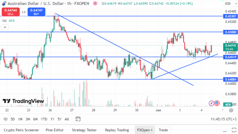 Hello everyone! The AUDUSD pair has an upward trend. Analyzing the H1 timeframe, I would like to note that the price, during its downward correction, was unable to break through the support level of 0.6451, having rebounded upward from it. I am considering purchases from this level with a target of the resistance level of 0.6500.