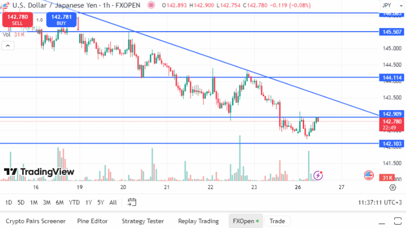 Hello everyone and have a successful trading day! The USDJPY pair continues to move downwards. At the same time, the price broke through the support level of 142.90 and consolidated below it. Now this level has become resistance and, as you can see, it is quite strong and constantly rebounds the price downwards when testing it. I am considering selling from this level with the target of the support level of 142.10.