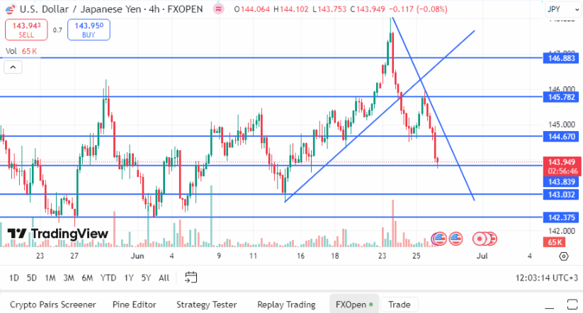 Hello everyone! The USDJPY pair has a downward trend, which formed after a downward breakout of the uptrend line formed earlier on the H4 timeframe. During its bearish movement, the price approached the support level of 143.83. In case of its breakout, the next target for the continuation of the downward movement may be the support level of 143.03, the second target may be the support level of 142.37.