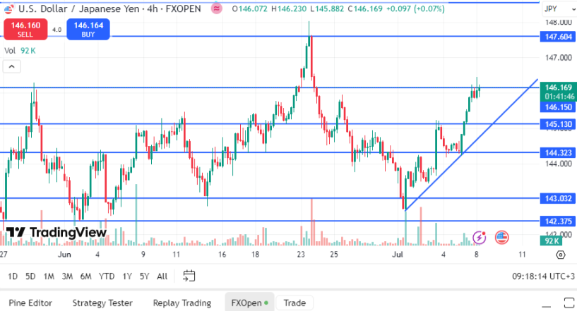 Hello everyone! The USDJPY price reached the resistance level of 146.15 during its bullish movement. In case of a rebound from this level downwards, the support level of 145.13 may serve as a target for sales. In case of an upward breakout of this level and consolidation of the price above it, the target for continuation of the bullish movement may be the resistance level of 147.60.