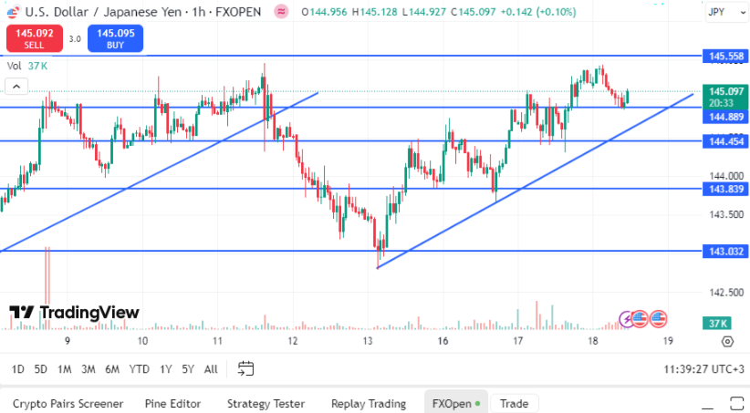 Hello everyone! The USDJPY pair has formed an upward local trend on the H1 timeframe. At the same time, the price broke through the resistance level of 144.88 and consolidated above it. Now it serves as support. Bullish movement is possible up to the resistance level of 145.55.