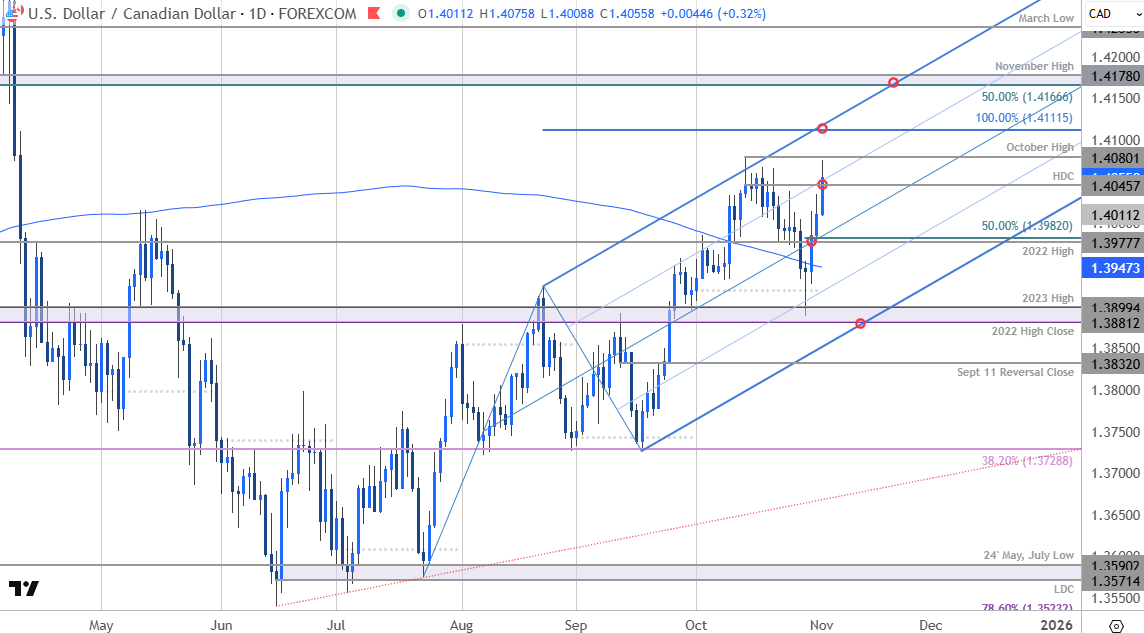 Bottom line: A V-shaped recovery off the October lows is now approaching multi-month highs. From a trading standpoint, losses would need to be limited to the median-line IF price is heading higher on this stretch with a close above 1.4080 needed to fuel the next leg of the advance. Subsequent resistance is eyed at the 100% extension of the June rally near 1.4111- look for a larger reaction there IF reached. Keep in mind we get the releases of the Canadian employment report on Friday with consensus estimates calling for a contraction of 20K jobs in October. Review my latest Canadian Dollar Weekly Forecast for a closer look at the longer-term USD/CAD technical trade levels.