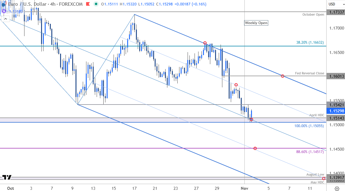 Initial resistance is eyed at 1.1542 with near-term bearish invalidation now lowered to the Fed reversal close at 1.1601. A break below / close below this key pivot zone would threaten resumption of the September downtrend with subsequent support seen at the 88.6% retracement of the August advance at 1.1452 and the May HDC / August low at 1.1386/92- look for a larger reaction there IF reached.