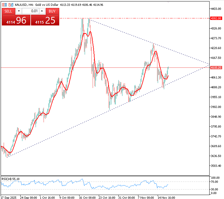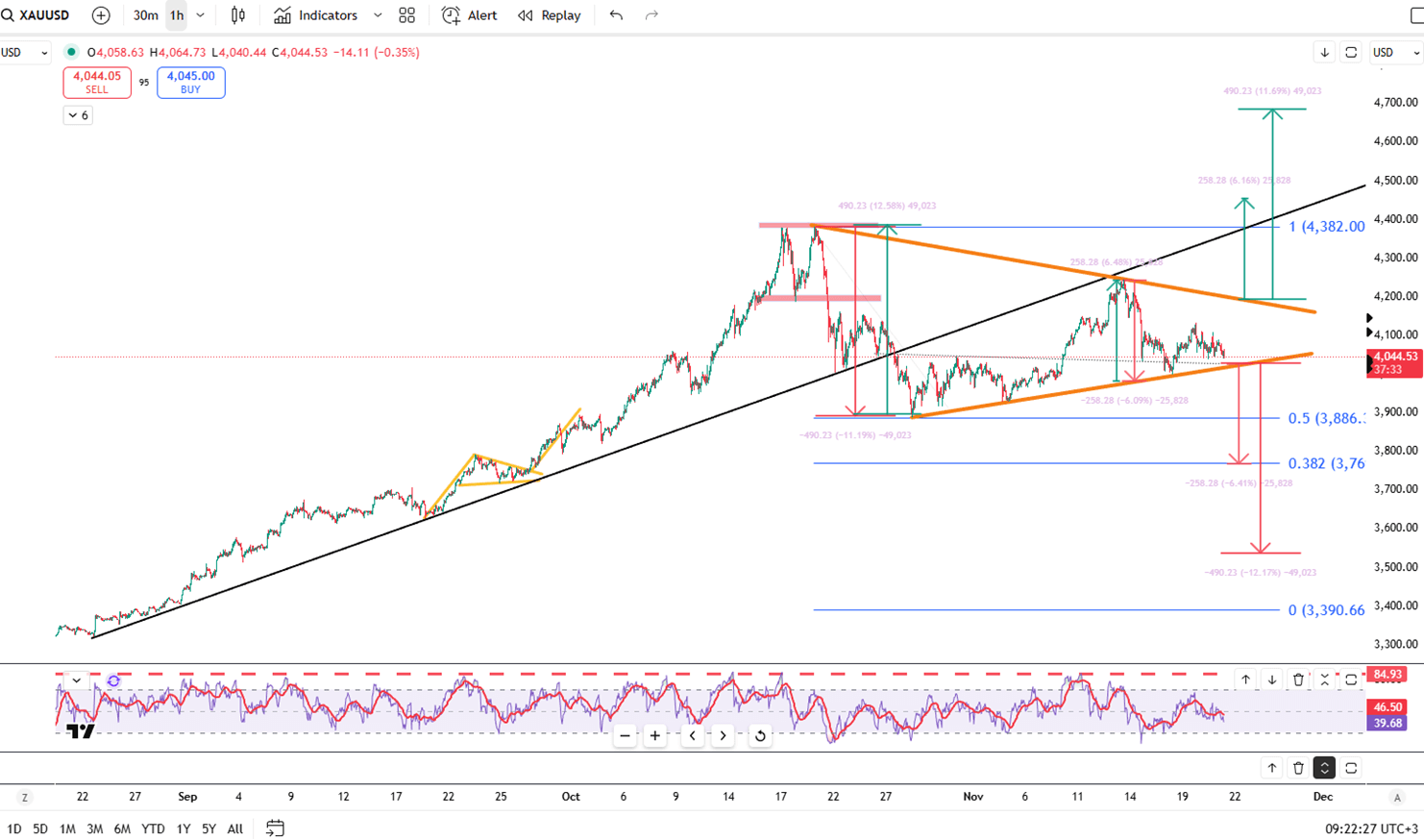 Expectations for a December rate cut have cooled, with markets now pricing a 46% chance compared with 63% last week. Ongoing concerns about stretched tech valuations are also weighing on risk appetite, helping support gold as equities trade with a softer tone.